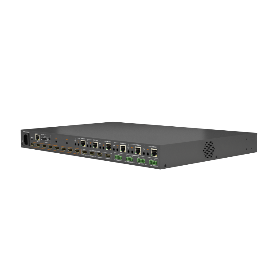The MX-0808-KIT v2 gets a make over, sharing many of the same powerful features of version 1, but with a vision of lite commercial installations in mind. Offering the same transmissions of 4K UHD up to 35m/115ft, but now up to 8 HDBaseT outputs with included receivers. Additionally, version 2 is equipped with 4 mirrored outputs, which can be paired with any of our HAOC hybrid optical HDMI cables to connect to 4 additional screens. Also new and fitting are 4 balanced analog audio outputs 2ch support to connect to ceiling/over-hanging speakers or to an audio amplifier. Lastly, still enjoy the same great features of version 1, including CEC triggering, A/V mute and standby mode to extend the life of the matrix during downtime.